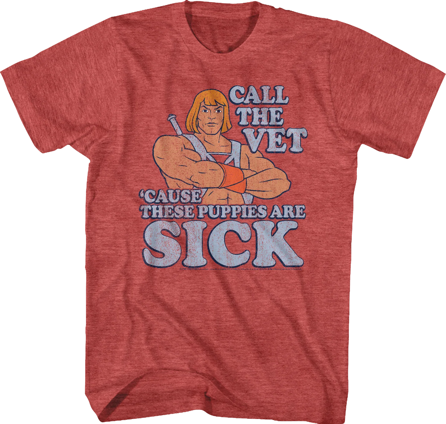 Flex your nostalgia with this hilarious Masters of the Universe tee featuring the mighty He-Man and the cheeky phrase "Call The Vet 'Cause These Puppies Are Sick." It's the perfect blend of 80s action-hero swagger and tongue-in-cheek humor for fans who remember when Prince Adam's power transformation was the coolest thing on Saturday morning TV. A fun tribute to the most powerful man in the universe and his legendary muscles.