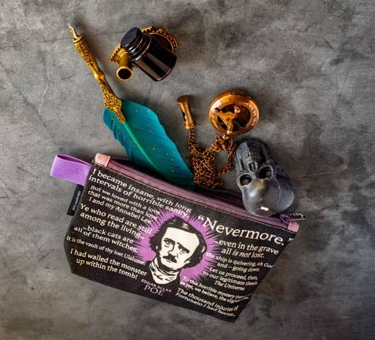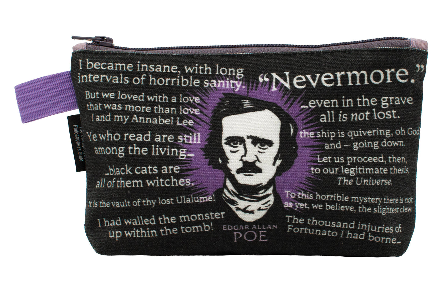On both sides there’s a dashing portrait of Edgar Allan Poe surrounded by a dozen quotes from his life and works This sturdy canvas pouch is the perfect place to stash that which you cannot lose – your crow quill pen, a bottle of ink. Halloween