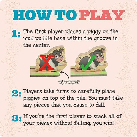 - For 1-4 players -- stack these pigs with friends or try to assemble all 12 piglets on the mud puddle alone. Warning: It’s not easy! Simple and addictive – just pass out the piglets and start stacking. With such a simple definition, you will have enough time for “just one more game!”