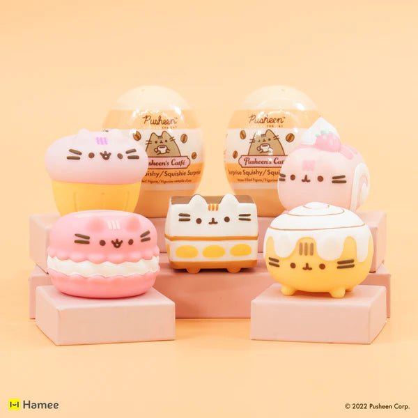 - [OFFICIALLY LICENSED SURPRISE SQUISHY] ♡ Curl up with a cup of coffee and relax with these sweet, stress relieving capsule squishies! This series of adorable squishy toys feature Pusheen the Cat disguised as some of her favorite café sweets – a macaron, a strawberry Swiss Roll, A slice of tiramisu, a cinnamon roll, and a muffin!