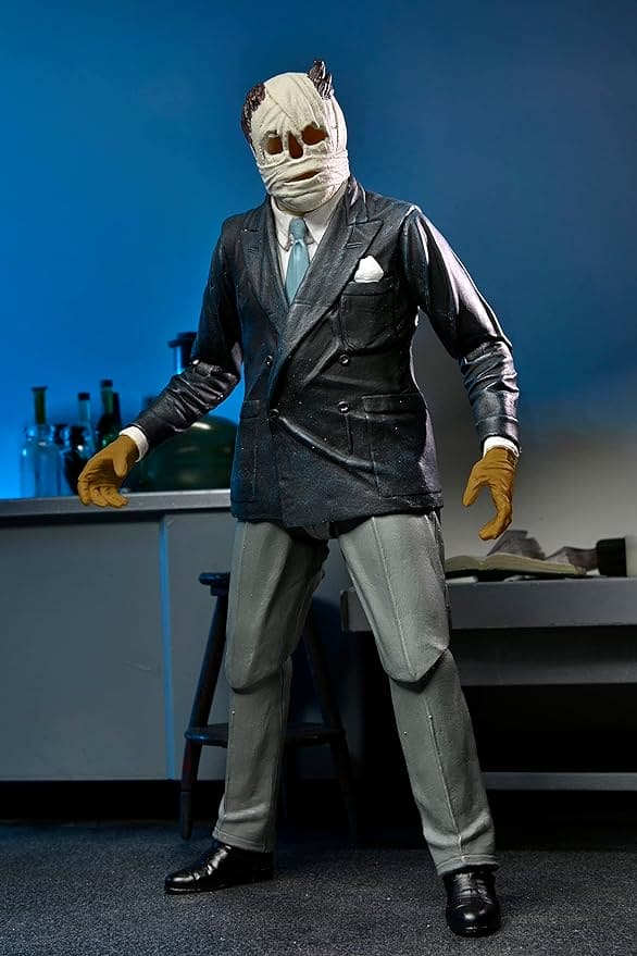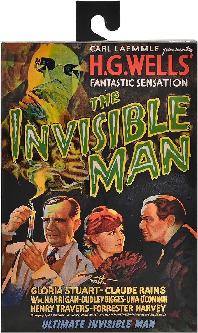 For the 90th anniversary of Universal's sci-fi horror film classic, NECA is excited to reveal The Invisible Man in Ultimate action figure form! Starring Claude Rains, 1933's The Invisible Man was based on the classic H.G. Wells novel and received critical acclaim, eventually being placed on the U.S. National Film Registry for its historical significance. The interchangeable heads capture the seemingly solid wrapped version as well as partially uncovered versions with peeks at the insane emptiness within. Also included are interchangeable wrapped and gloved hands, goggles, nose, notebook, wig, and cup with straw. The figure stands in 7” scale and comes in display-friendly window box packaging with opening front flap.
