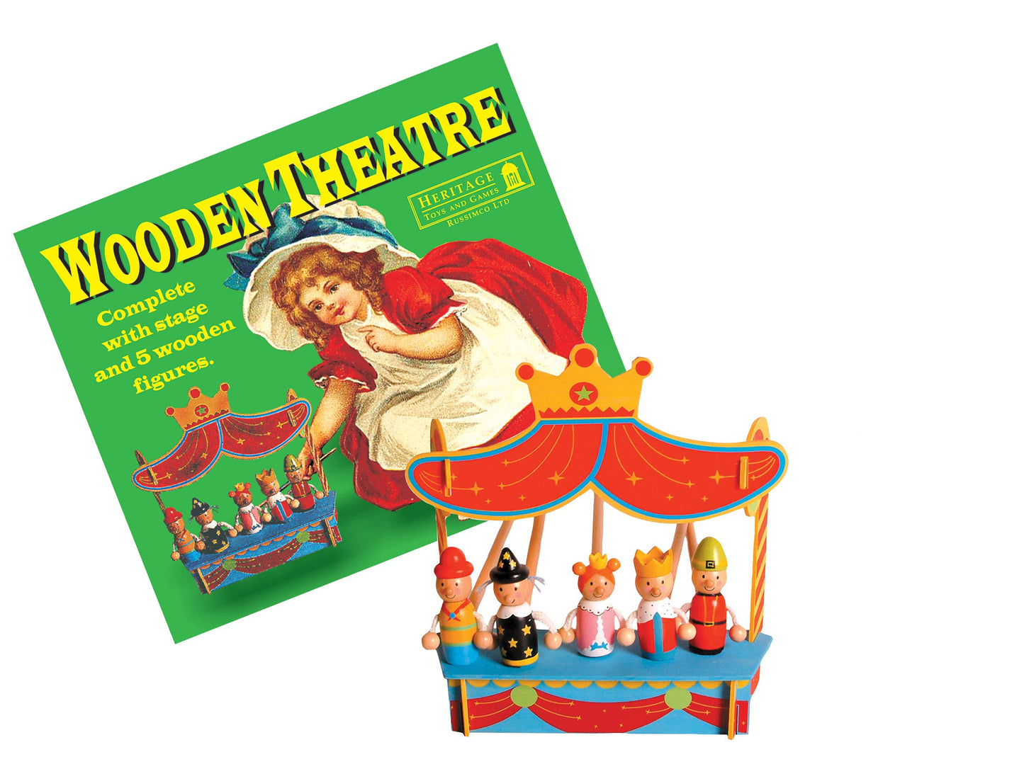 Super cute and classic old time music hall image. Hand Painted characters: King, Queen, Wizard, Jester and Princess. Small painted stage fits together and disassembles for storage